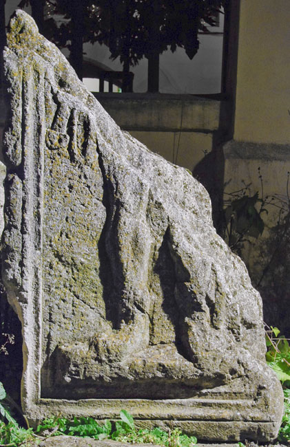 - Auf flachem Podest stehender Mann mit hohen Schuhen, an seiner rechten Seite Schwertgriff (?).