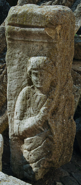 - Stehender bärtiger Man in Ärmeltunica und Mantel (Toga ?). Oben profilierter Rahmen. Nebenseite eines Grabaltars ?