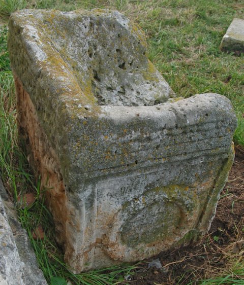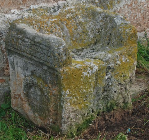 - unten abgebr., oben zum Sitz ausgehöhlt, Inschrift abgearbeitet ?, stark verwittert
