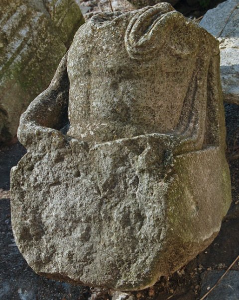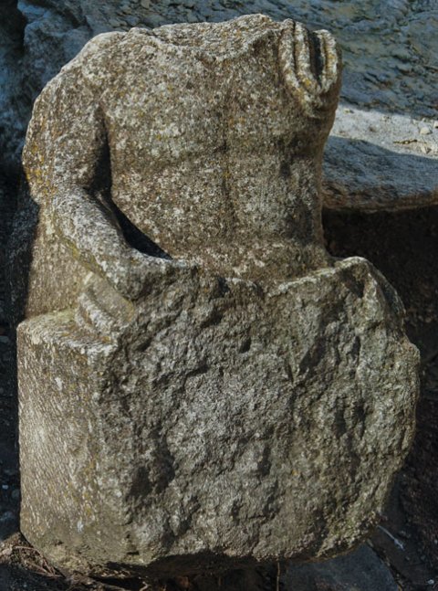 - Kopf, linker Arm, rechte Hand, Vorderseite der Beine abgebr., unten verbr.