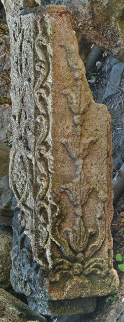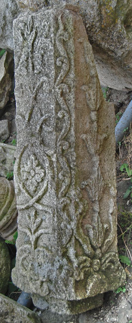 - Auf drei Seiten reliefierter Pfeiler (Pilaster ?), auf der Vorderseite unten Blattkelch, darüber Ranken. Auf den Nebenseiten Kandelaberornament. Auf den abgeschrägten Vorderkanten Ranken.