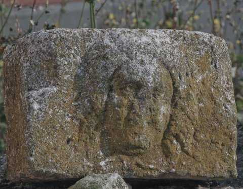 - verwittert, Nebenseiten geglättet, in der Oberseite Dübelloch, unten abgeschnitten (?)