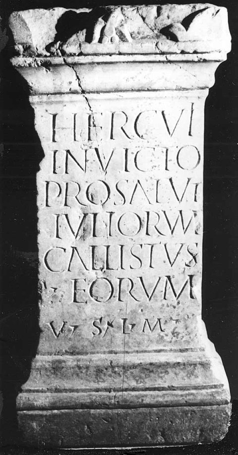 - Herculi / invicto / pro salut(e) / Iuliorum / Callistus / eorum / v(otum) s(olvit) l(ibens) m(erito)