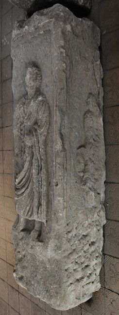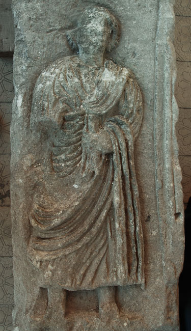 - Eckblock: auf der Vorderseite stehender Togatus (bartloser Jüngling mit Locken), in der Linken Rolle (volumen). Auf der rechten Nebenseite Reliefreste (Tiere), linke Seite zerstört.