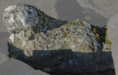 - Auf halbrundem Balken (Lorica) liegender Löwe von der Mauer eines Grabbezirks.