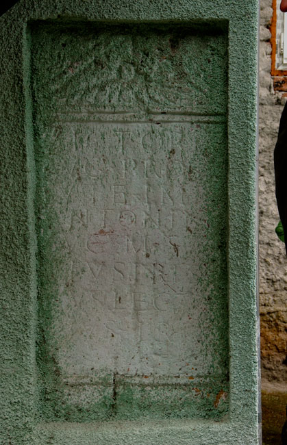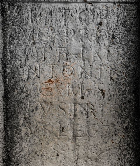 - Victoriae / Aug(ustae) pro sa/lute Imp(eratoris) / Antonini / Aug(usti) M(arcus) Sta/tius Pris/cus legatus / eius pr(o) pr(aetore)
