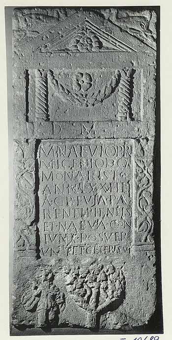 Im Hauptbild zwischen Säulen mit Spiralkanneluren Girlande und Rosette. Schriftfeld zwischen Rankenpilastern. Im Sockelbild Jagdszene: Baum, links Mann mit Sagum und Speer, rechts Raubtier (?). - Inschrift