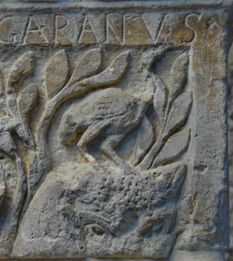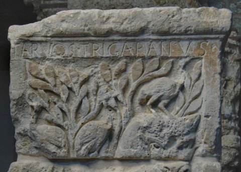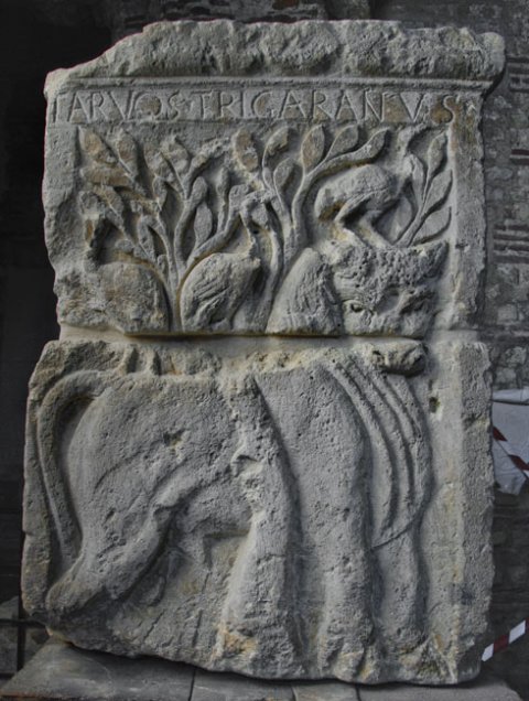 - Mythische Figuren: Jupiter (Iovis) mit Szepter und Blitz. Stier (Tarvos Trigaranus) mit drei auf seinem Rücken und Kopf stehenden Vögeln (Kraniche) und Baum. Vulcanus (Volcanus) mit Zange und Hammer. Esus beim Schneiden von Ästen eines Baums. Über den Figuren Namensbeischriften.