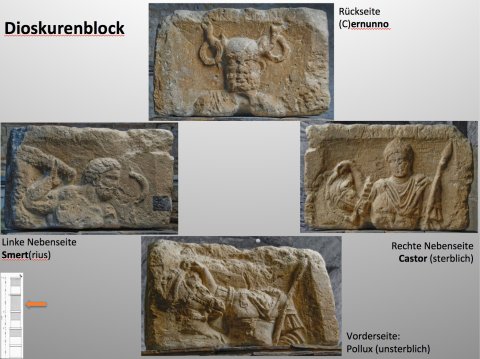 - Mythische Figuren: Cernunnos mit Geweih, an dem Torques hängen. Dioskuren mit Panzer, Mantel, Lanze, Pferd. Smertrios mit Bogen und Keule. Über den Figuren Namensbeischriften;