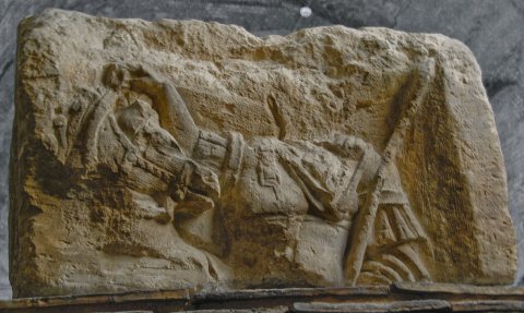 - untere Hälfte fehlt, stark bestoßen u. verwittert