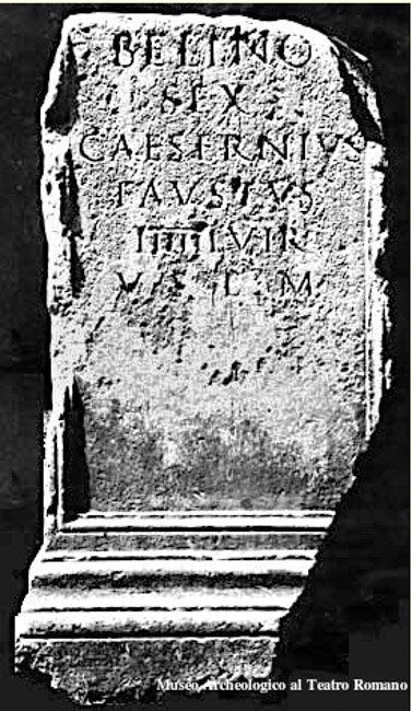 - Belino / Sex(tus) / Caesernius / Faustus / IIIIIIvir / v(otum) s(olvit) l(ibens) m(erito)