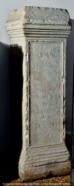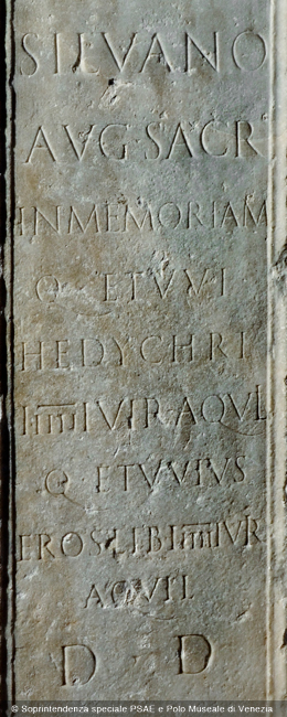 - Silvano / Aug(usto) sac(rum) / in memoriam / Q(uinti) Etuvi / Hedychri / IIIIIIvir(i) Aquil(eiae) / Q(uintus) Etuvius / Eros lib(ertus) IIIIIIvir / Aquil(eiae) / d(onum) d(edit)