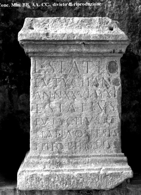- L(ucio) Statio / Eutychiano / ann(orum) XXVI m(ensium) XI / L(ucius) Statius / Eutychus et / Statia Onesis / filio pientiss(imo)