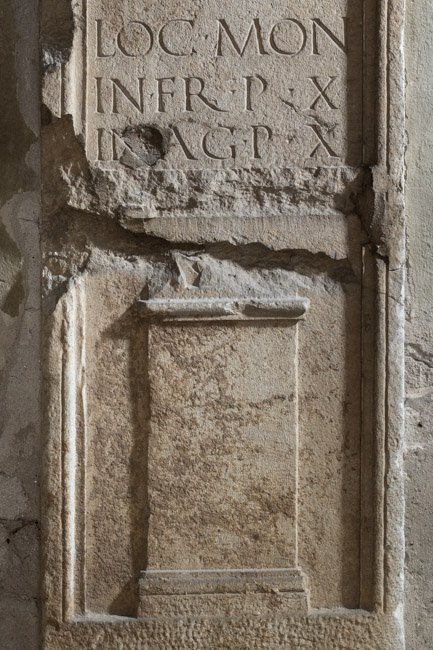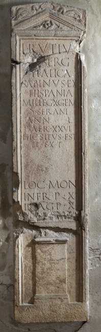 - L(ucius) Rutius / L(uci) f(ilius) Serg(ia) / Italica / Sabinus ex / Hispania / mil(es) leg(ionis) X Gem(inae) / |(centuria) Serani / ann(orum) L / aer(um) XXVI / hic situs est / h(eres) ex t(estamento) / loc(us) mon(umenti) / in fr(onte) p(edes) X / in ag(ro) p(edes) X