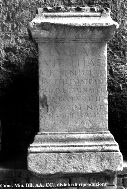 - Luciae / Vitelliae / q(uae) et Senecill(a) / L(uci) Vitelli Materni / |(centurionis) leg(ionis) X Geminae fil(iae) / [S]empronius Stella / [|(centurio) l]eg(ionis) X Geminae / coniugi piissimae et / castissimae