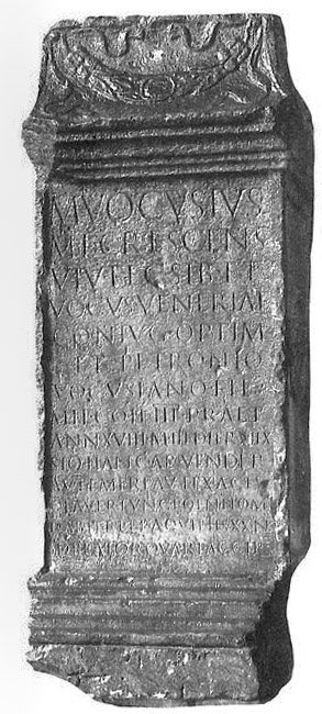M(arcus) Vocusius / M(arci) l(ibertus) Crescens / viv(us) fec(it) sib(i) et / Vocus(iae) Veneriae / coniug(i) optim(ae) / et Petronio / Vocusiano fil(io) / mil(iti) coh(ortis) III praet(oriae) / ann(orum) XVIII m(ensium) III dier(um) XIIX / si q(uis) hanc ar(am) vender(e) / aut emere aut exacis/claver(e) tunc poen(ae) nom(ine) / dabit rei p(ublicae) Aquil(eiensium) HS XX(milia) n(ummum) / delator quart(am) accip(it)