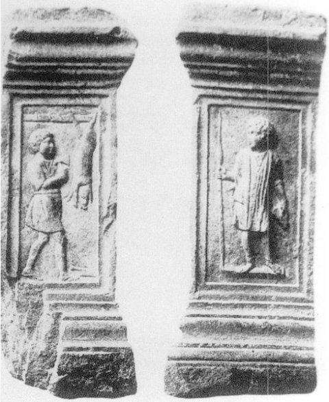 - Auf den gerahmten Nebenseiten links Mann in kurzer Tunica (Diener) beim Zerteilen eines Schweins, rechts auf flacher Standleiste Mann (Soldat) in Paenula und Stiefeln mit Pilum.