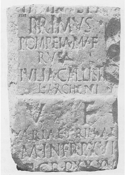 - T(itus) Atilius C(ai) f(ilius) / Primus / Pompeia M(arci) f(ilia) / Rufa / Iulia Callisti / l(iberta) Archeni[a] / v(ivi) f(ecerunt) / Variae Primae / l(ocus) m(onumenti) in fr(onte) p(edes) XVI / in agr(o) p(edes) XXXV