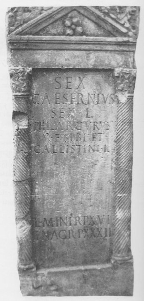 - Sex(tus) / Caesernius / Sex(ti) l(ibertus) / Philargurus / v(ivus) f(ecit) sibi et / Callistini l(iberto) // l(ocus) m(onumenti) in fr(onte) p(edes) XVI / in agr(o) p(edes) XXXIII