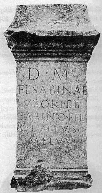 - D(is) M(anibus) / Fl(aviae) Sabinae / uxori et / Sabino fil(io) / T(itus) Iulius / Melus