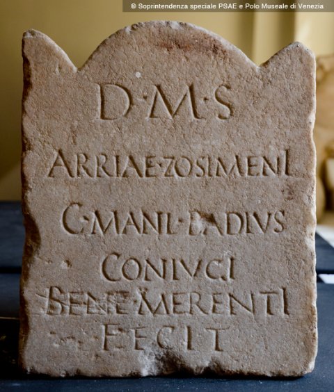 - D(is) M(anibus) s(acrum) / Arriae Zosimeni / C(aius) Manl(ius) Badius / coniugi / bene merenti / fecit