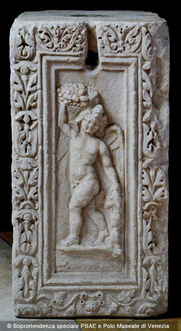 - Rahmenleiste um das Schriftfeld mit Akanthusranken. Auf den Nebenseiten Genius (Erot, Jahreszeit) mit Fruchtkorb und Tier, auf den seitlichenn Rahmenleisten Akanthuskelchornament, unten Krater mit Weinranken, oben Akanthuspalmetten-Fries.