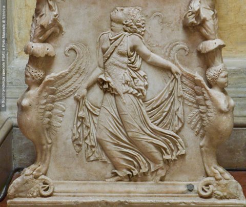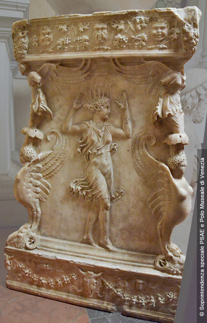 - Dreiseitige Basis. An den Ecken der Deckplatte Ammonsköpfe, dazwischen Weinlaub mit dionysischen Attribute und Satyr- und Pansmasken. Auf dem Schaft auf der Vorderseite tanzende Mänade im Chiton, auf den Nebenseiten Kalathiskos-Tänzerinnen. An den Ecken auf Widderköpfen stehende Sphingenprotomen, darüber geflügelte Frauenfiguren. Auf den Seiten des Sockels Bukranien mit Girlanden.