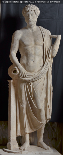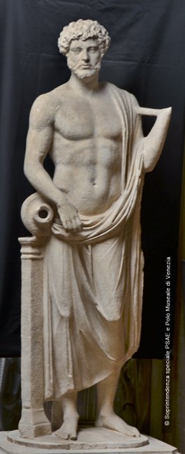 - Mythische Figur: überlebensgroße Statue des Aponus mit bärtigem Porträtkopf, Mantel um Hüften und linke Schulter, neben dem rechten Bein Pfeiler mit Wassergefäß.