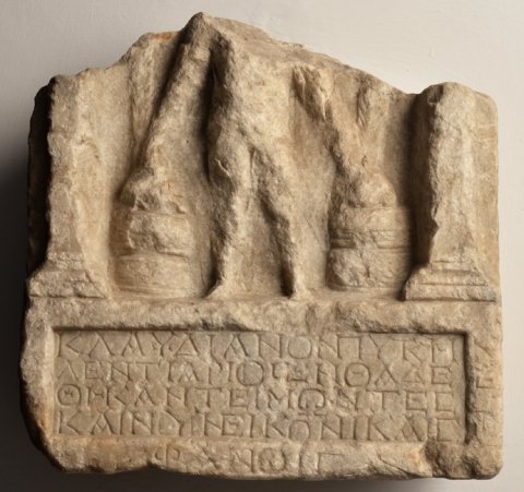 - Über der einfach gerahmten Schrifttafel Relief mit stehendem nackten Mann zwischen Pilastern. In beiden Händen Siegeskränze, seitlich Cisten und Palmzweige.