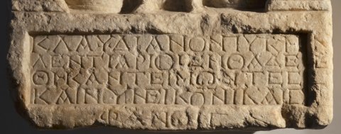 Κλα∙υ∙διανὸν πύκτην / λεντιάριοι ἐνθάδε ἔ/θηκαν, τειμῶντες / καὶ νῦν εἰκόνι καὶ στε/φάνοις.