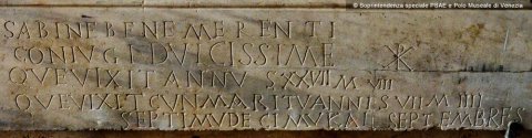 - Sabin(a)e bene merenti / coniugi dulcissim(a)e (Christogramm) / qu(a)e vixit annus (!) XXVII m(enses) VIII / qu(a)e vixit cun (!) maritu (!) annis VII m(ensibus) IIII / septimu(m) decimu(m) Kal(endas) Septembres