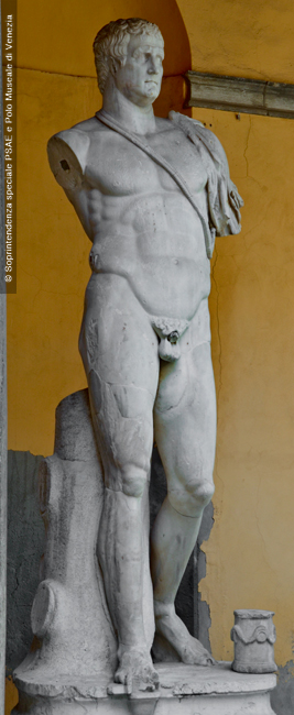 - Historische Person (sogen. Agrippa): nackte Kolossalstatue eines Feldherrn mit bartlosem Porträtkopf, Schwertgurt und Mantel auf der linken Schulter.