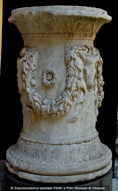 - Rundaltar mit Bukranien und Girlanden mit Tänien, in den Girlandenbögen Rosetten. Inschrift zwischen zwei Bukranien. Oben und unten Profil mit Lotus-Palmetten-Fries und Astragalstab.