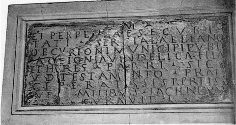 - [D(is)] M(anibus) / [et perpetu]ae securi(tati) / [P(ublio) Ceionio] Sergia Laeliano / [dec]urioni municipi(i) Publ/ia Ceionia Vindelica fil(i)a / et heres patri sic/u<t=D> testam[e]nto pra<e=I>/ceperat sestertis / VI milibus faciendum / curavit