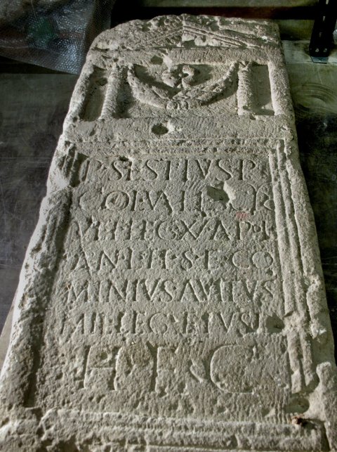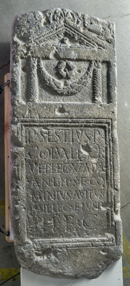 P(ublius) Sestius P(ubli) (!) / Col(lina) Vale(n)s Cyr(rho) / vet(eranus) leg(ionis) XV Apol(linaris) / an(norum) L h(ic) s(itus) e(st) Co/minius Avitus / mil(es) leg(ionis) eiusd(em) / h(eres) f(aciendum) c(uravit)