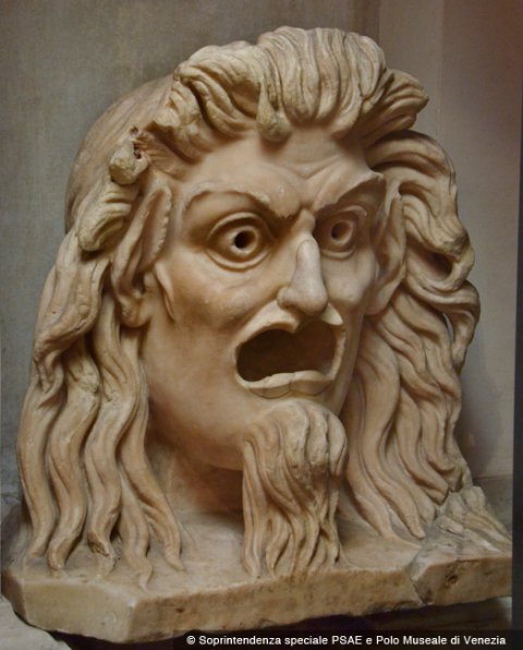 - Zwei Theatermasken auf eckigem Sockel und flacher Basisplatte: bärtiger Satyr mit Tierohren und langem Haar.