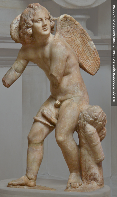 - Mythische Figur: bogenspannender kindlicher Eros mit Scheitelzopf und langen Locken;