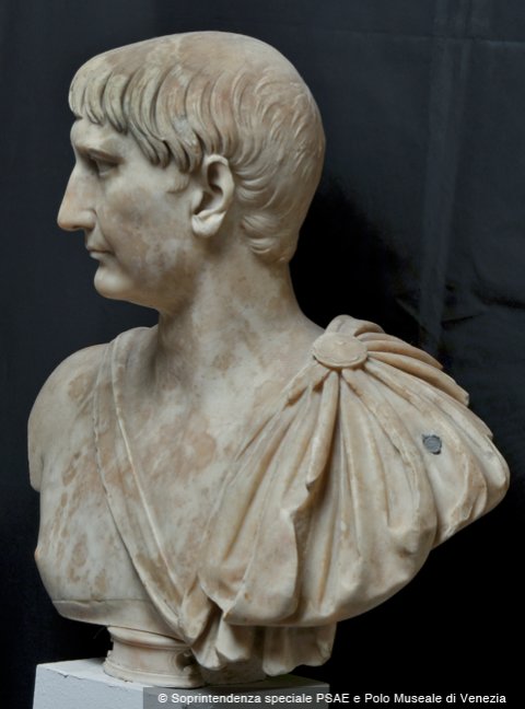 - Historische Person: Porträtbüste des Trajan mit Schwertgurt und Mantel auf der linken Schulter.