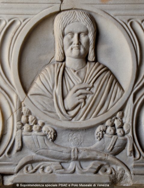 - Riefelsarkophag: im Zentrum Medaillon mit Porträtbüste einer Frau über gekreuzten Füllhörnern, seitlich je ein stehender Jüngling mit Fackel (Genius) und um die Brust gelegter Girlande.