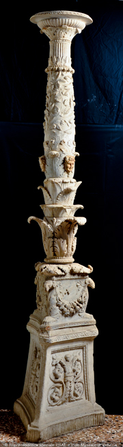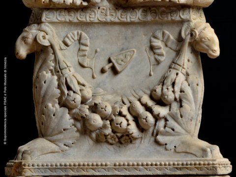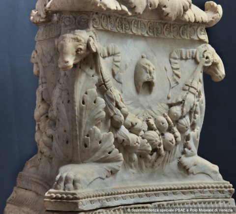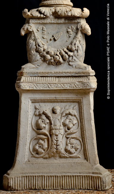 - Auf der unteren Basis auf drei Seiten Ranken mit Blattkelch, aus dem Büste mit Strahlenkranz (Sol ?) wächst. Auf der oberen Basis an den unteren Ecken Löwenpranken, an den oberen Widderköpfe, zwischen denen Girlanden hängen. In den Girlandebögen sakrale Geräte. Die folgenden Blattkelche sind neuzeitlich. Darüber balusterförmiger Schaft mit Zweigen mit Früchten und Vögeln (antik) und säulenförmiger oberer Abschluss (16. Jh.).