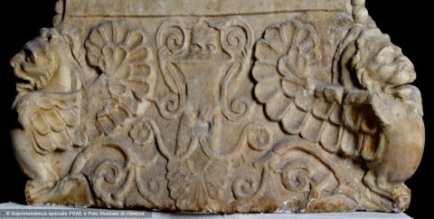 - Dreiseitige Basis. An den unteren Ecken Protomen von Löwengreifen, dazwischen Ornament aus Blütenranken, Palmette, Volutenkrater und menschlicher Figur (Silen ?). Darüber Bildfelder mit mythischen Figuren : Isis, Anubis und Harpokrates.