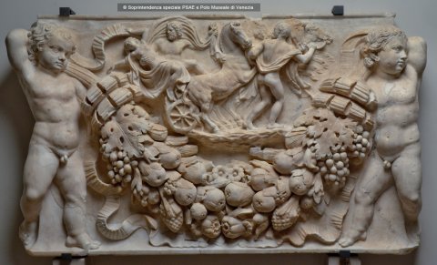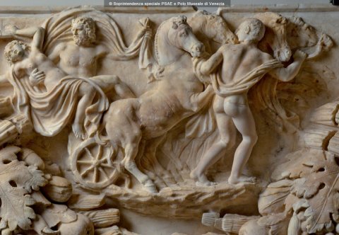 - Mythos: Genien tragen Girlande mit Früchten und Tänien. Im Girlandenbogen Raub der Proserpina.
