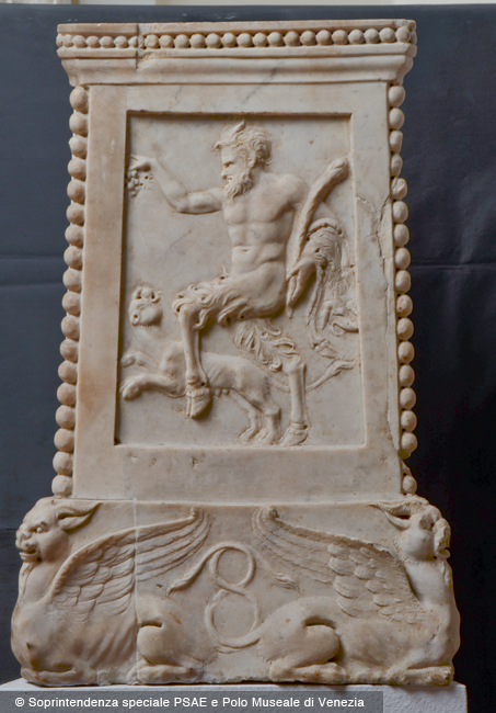 - Dreiseitige Basis. In der Sockelzone liegende Greifen. Darüber Bildfelder mit mythischen Figuren: tanzende Mänade (Agaue mit Kopf des Pentheus ?), laufender Satyr mit Fruchtschale und Pantherfell, Pan mit Pedum und Traube, neben ihm Panther. Vor Mänade und Satyr je ein brennender Altar.