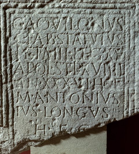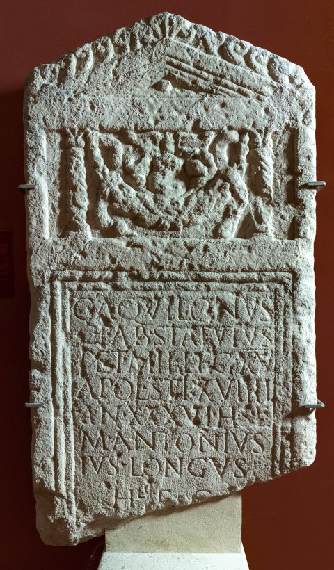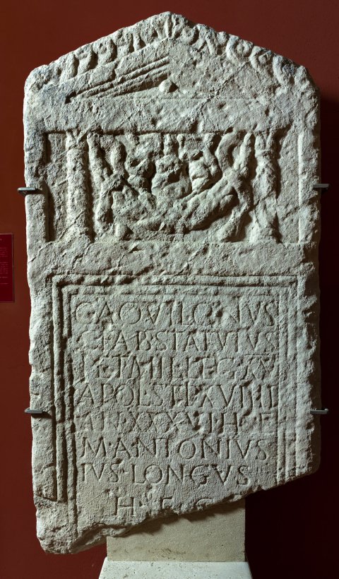 - C(aius) Aquilonius / C(aii filius) Fab(ia) Statutus Pet(avio) mil(es) leg(ionis) XV / Apol(linaris) stip(endiorum) XVIIII / an(norum) XXXVI h(ic) s(itus) e(st) / M(arcus) Antonius / ius(!) Longus / h(eres) f(aciendum) c(uravit)