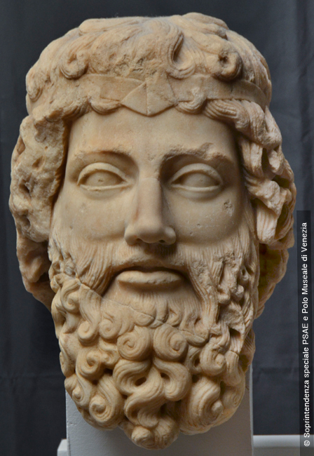 - Mythische Figur: Hermeskopf mit langen Locken mit Binde und langem Bart. Teil einer Herme ?