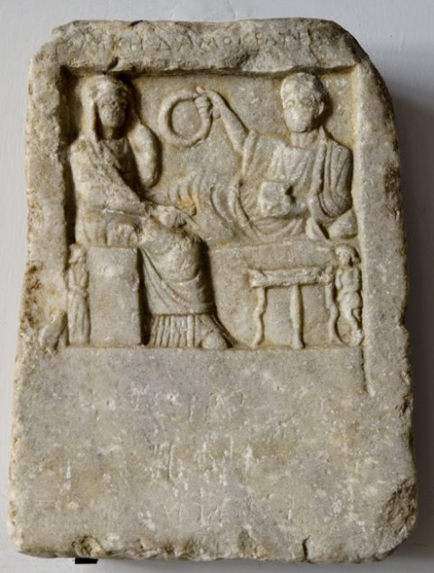 - Totenmahl mit auf Kline gelagertem Mann mit Kranz in der Rechten und Becher in der Linken. Links sitzende Frau mit über den Kopf gezogenem Mantel, neben ihrem Sitz kleine Dienerin. Vor der Kline dreibeiniger Tisch und kleiner Diener.