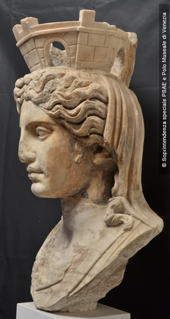- Mythische Figur: Tyche mit Mauerkrone und Schleier über dem Hinterkopf.