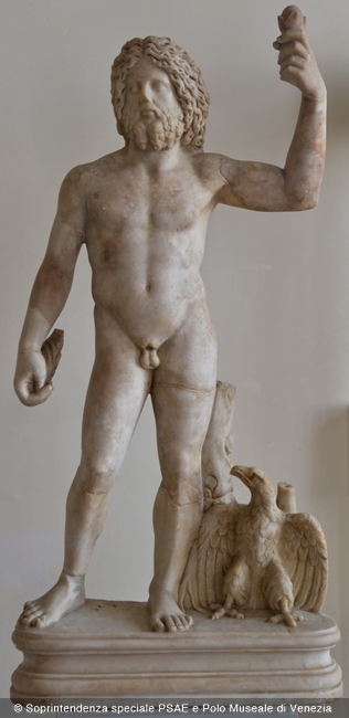 - Mythische Figur: Zeus - Jupiter, nackt, in der Rechten Blitzbündel, in der Linken Szepter, beim linken Bein Adler und Baumstammstütze.