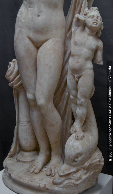 - Mythische Figur: stehende nackte Aphrodite (Venus), Mantel um den linken Arm, neben dem rechten Bein Vase, neben dem linken auf Delphin stehender Eros (Amor).