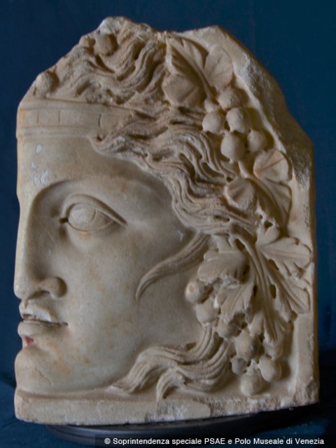 - Akroter eines Sarkophagdeckels mit dionysischem Kopf mit langen Locken und Weinlaubkranz mit Trauben